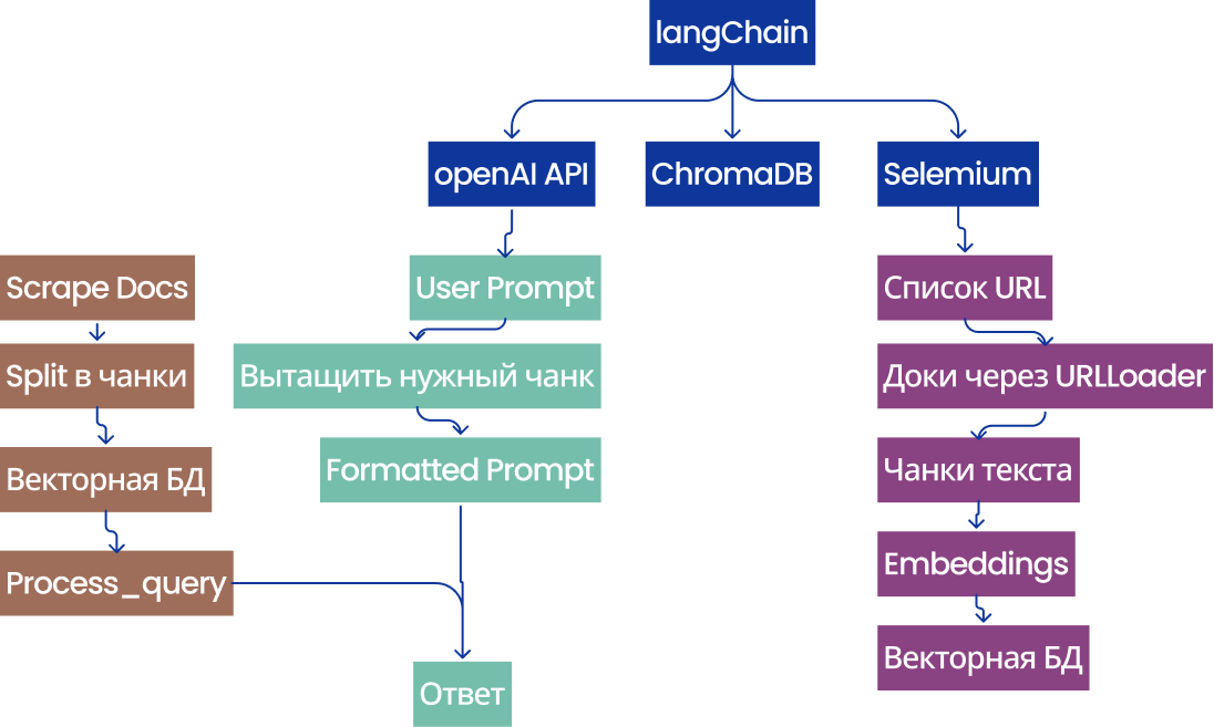 - подготовка данных: загрузка данных, препроцессинг и структурирование. Разбивка на чанки, эмбеддинг